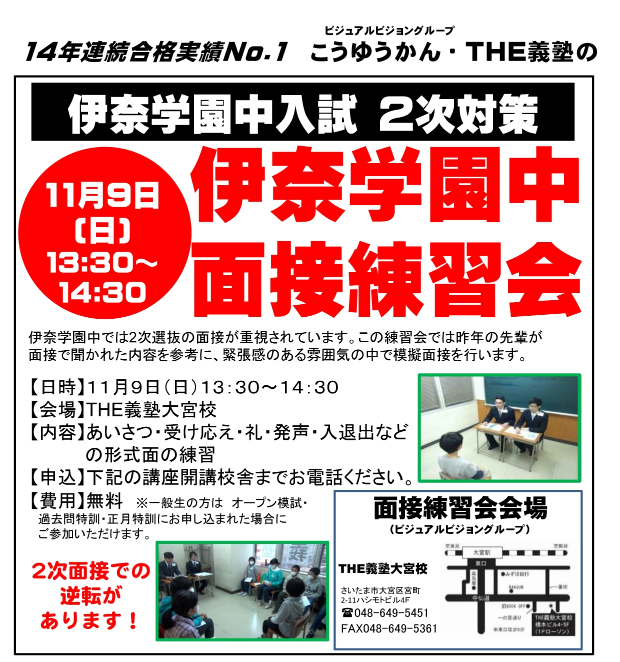 THE義塾・こうゆうかんでは、伊奈学園中入試2次対策の面接練習会を行います。